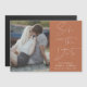 Esta imã salve a data inspirada no deserto apresenta uma fotografia (orientação para retratos) e uma caligrafia moderna que diz "Salvar a Data" em rosa-claro e claro contra um fundo de ferrugem de terracota. Personalize com seus nomes, data do casamento e local do casamento abaixo da caligrafia casual.