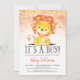 É um menino! Um convite para chá de fraldas de um safari laranja bonito. Fundo de aquarela e striped para trás.