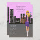 Um convite moderno com uma paisagem urbana ao fundo e uma linda jovem atravessando uma rua e segurando uma bolsa. Este é um convite maravilhoso para uma festa de aniversário de adolescente, despedida de solteira ou um convite para fazer compras.