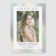 Anuncie sua formatura com nossos ímãs holográficos de anúncio de graduação. Os cartões magnéticos de graduação modernos apresentam a foto do formando moldada em branco com uma mãe holográfica multicolorida de fundo pérola em tons de roxo, aqua, verde, rosa e amarelo. O "Formando" aparece no topo em caracteres negros modernos. Personalize o ímã de graduação holográfico adicionando o nome do formando, o nome da escola e o ano de graduação.