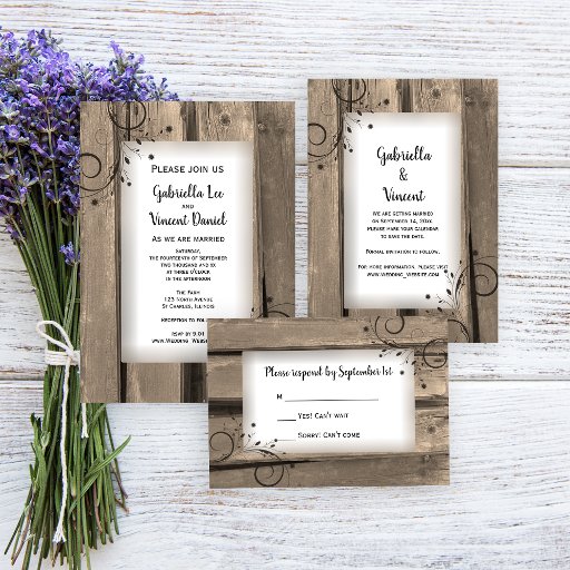 Convide convidados para o seu casamento iminente com o charmoso Campo Madeira Celestial e Flores Invitação Magnética de Casamento. Este Convite de casamento rústico, casual, porém clássico, do Magnet apresenta uma fotografia em tons de sépia quentes de madeira de celeiro estilhaçada e termal com espirais pretas enfeitando os cantos.