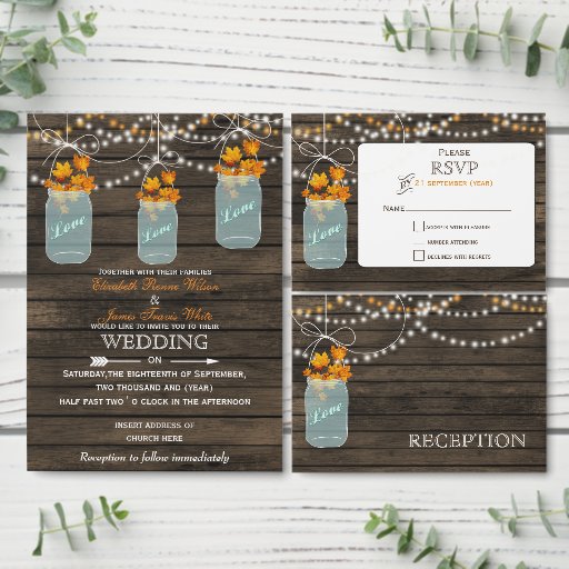 Lenha rustica de celeiro, luzes de cordas com folhas de maple em um jarro de pedras caem magnético Salve a data. Produtos correspondentes também disponíveis.