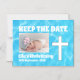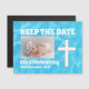 Lembrete magnético "Keep the Date" Christening. Simples design de água e uma cruz com espaço para uma foto.