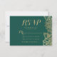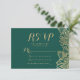 Um moderno e elegante convite de casamento com letra manuscrita verde escura e dourada com tema de mandala floral pintada à mão.