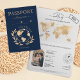 Modern Boho World Map Invitation Destination, como passaporte, com seu monograma. cor azul de fundo do marinho