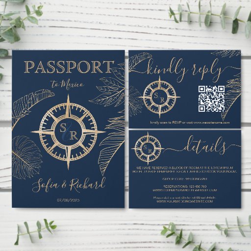 Moderno e Elegante Mapa Mundial do México Convite Destino de Casamento, como passaporte.Ouro crista de bússola com monograma na primeira página, fundo azul empoeirado