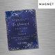 Um fundo azul marinho, decorado com falso brilho prateado, faíscas e flores azuis. A cor azul é irregular. Personalize e adicione seus nomes e detalhes.