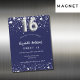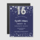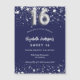 Um cartão magnético de convite moderno, na moda e glamouroso para uma doce festa de aniversário 16, 16. Um fundo azul marinho, decorado com estrelas de falso prata. Personalize e adicione seu nome e detalhes da festa. O número 16 é escrito com uma fonte no estilo do balão.