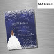 Um convite magnético moderno, na moda e glamouroso para uma Quinceañera, festa de aniversário 15. Um fundo azul marinho com brilho sujo, brilhos, uma garota vestindo um vestido de bola. A cor azul é irregular. O nome é escrito com um moderno estilo escrito à mão. Personalize e adicione os detalhes da sua festa.