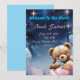 Dê as boas-vindas ao seu menino da maneira mais doce! Este convite sonhador apresenta um ursinho de pelúcia fofinho segurando um recém-nascido dormindo, contra um céu noturno mágico cheio de estrelas cintilantes. Perfeito para chás de bebê, anúncios de nascimento ou festas de boas-vindas. Edite e personalize facilmente para o seu evento especial!