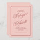 Este convite para o casamento apresenta um design elegante e moderno, com um fundo cor-de-rosa suave e texto vermelho profundo. Os nomes são mostrados em uma fonte de script na moda, fluindo, adicionando um toque de romance e sofisticação. Os demais detalhes, incluindo a data do casamento, a hora e a localização, são apresentados em uma fonte sans-serif limpa e minimalista para facilitar a leitura. Uma borda retangular fina e arredondada molda o conteúdo, melhorando a estética geral refinada. A combinação de tons de pastel macio e tipografia clássica torna este convite perfeito para uma celebração de eterno e chic.