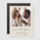 Este simples e minimalista cartão magnético Save the Date apresenta uma foto quadrada acima das palavras "Save the Date" (Salvar a data) em um elegante guião branco, seguido pelos nomes dos casais, pela data do casamento e pela cidade em sans serif em um fundo bege.