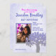 Combine facilmente as cores do texto à sua foto neste belo convite azul e prateado brilhante! Celebre o seu Bat Mitzvah com o tema da "Árvore da Vida" azul-céu, shimmery. Não esqueça o papel de carta coordenado e a decoração partidária!
