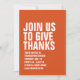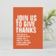 Com uma tipografia branca ousada, este convite jante de Ação de Graças laranja é facilmente personalizado e dá o tom para um banquete divertido e casual do dia da turquia