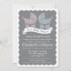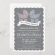 Dois carrinhos de bebê bonitos do estilo do laço (pram/carrinho de criança/carruagem) são decorados com pássaros de bebê e redemoinhos das videiras. Uma beira scalloped termina este convite moderno do chá de fraldas. Muito doce e fácil personalizar com seu próprio texto. Ilustração original pelo pj_design. Verifique por favor minha loja para ver se há mais como esta.