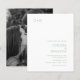 Convite para casamento de orçamento moderno com um layout simples e minimalista com seu monograma no canto superior esquerdo e seus detalhes de casamento no canto inferior direito. O fundo tem sua foto favorita. Todos os elementos de design estão em verde de sábio sobre um fundo branco e podem ser alterados na ferramenta de edição de design. Este convite de casamento chic com um design mínimo, mas elegante, vai bem com qualquer estilo de casamento contemporâneo.