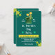Organize uma celebração inesquecível no dia 17 de março com este convite moderno e elegante para o Dia de São Patrício. Contra um fundo azul-turquesa profundo com sapatinhas de trevo vibrantes na cor lime, o design apresenta um chapéu verde festivo com moedas de ouro flutuando acima. O layout claro e fácil de ler inclui um banner amarelo proeminente para o seu local e seções dedicadas a todos os detalhes do seu evento, desde a comida irlandesa tradicional até as informações de RSVP. Perfeito para encontros de vizinhos, bares ou banquetes familiares!