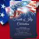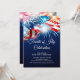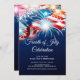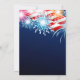 O convite moderno para fogos de artifício no dia 4 de julho, com fogos de artifício azuis, vermelhos e brancos e a bandeirola americana, está definido em fundo azul. Sacudir da parte de trás do nosso feriado patriótico de verão para ver uma correspondência de volta. Na moda convite para um churrasco comemorativo do dia 4 de julho, biscoito do dia do trabalho, festa do dia do trabalho ou qualquer partido patriota temático.