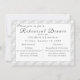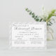 Design apresenta a aparência do local branco como fundo para suas informações, que é exibido em uma fonte prateada contra um suporte branco. No cabeçalho lê-se, "Por favor, junte-se a nós para um Janto de ensaio em homenagem a" Os nomes do casal junto com a cidade e o estado do evento são mostrados logo abaixo do título. O primeiro sobrenome inicial do casal é exibido em uma fonte grande e branca no lado oposto. Muito elegante. Projetado para coordenar com a coleção de Suite Casado Monograma Católico de Lace Branco.