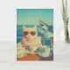 Um gato legal vestindo óculos de sol cor-de-rosa e um cachecol gosta de chá em uma mesa à beira-mar enquanto um tubarão dramático salta do oceano ao fundo.