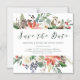 Este elegante casamento de feriado salva os cartões de data com flores rústicas de aquarela com pinecones, ramos, bagas, folhas, rosas brancas e caligrafia adorável.