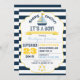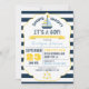 O marinho e a listra branca imprimem o fundo com o cartão náutico do convite do chá de fraldas do menino do flutuador do veleiro e da vida-poupança.