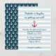 Convite náutico do casamento, caracterizando uma âncora vermelha em um fundo listrado azul e branco. Teste padrão de coordenação da âncora na parte traseira. Coordenadas com o resto de minha série náutica do casamento!