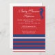 O convite náutico moderno do chá de fraldas do cavalo marinho ajustou-se em um fundo vermelho com um pensionista da listra vermelha, branca e azul. Aperfeiçoe para um chá de fraldas do bebé ou um bebê. chá de fraldas da menina. Visite nossa loja para ver nossa grande seleção do bebê náutico do veleiro. regue convites. design do ©Blackleaf