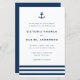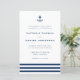 Convite de casamento moderno e clássico, perfeito para casamentos temáticos náuticos e casamentos de verão. Ele apresenta uma ilustração de âncora azul marinho, tipografia clássica e um padrão de listras. Os textos são perfeitamente editáveis. Personalize adicionando nomes, data, hora e outros detalhes do evento.