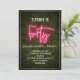 Um convite de trigésimo aniversário com o texto "Quarenta" em design neon rosa sobre um fundo inspirado em folhagem de buxo com texto branco personalizado.