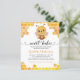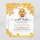 Este adorável convite de chá de bebê com orçamento apresenta imagem com o texto "Bebê Doce" com uma abelha segurando um pote de mel cercada por favos de mel. A parte de trás apresenta favos de mel, potes de mel e abelhas voando. Fácil de personalizar clicando em "Personalizar".