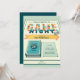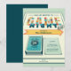 Game Night Invitation apresentando uma divertida tipografia de "Game Night''. Esses designs incluem elementos de azul, amarelo, vermelho e laranja, um fundo de conselho de jogos, dados, peças de jogos, cartões de jogos e elementos inspirados nos jogos de conselho. Os produtos incluem um modelo para personalização pessoal.