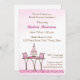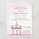 Um convite à moda para um almoço do chá de panela ou da dama de honra com mesa floral e cadeiras, o bolo de casamento com chapéu de coco dos noivos e a beira floral cor-de-rosa.