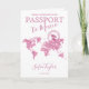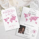Chá de panela do Mapa do Mundo Moderno e Elegante, como passaporte. Detalhes cor-de-rosa e carimbo de "aventura espera"