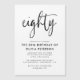Este convite de aniversário moderno, preto e branco, apresenta a tipografia moderna clássica. A palavra "oitenta" aparece na caligrafia do estilo do script. Perfeito para dar o tom de na moda para uma maravilhosa, oitenta celebração da festa de aniversário. O esquema de cores do convite é fácil de personalizar - tanto o fundo quanto a tipografia - então sinta-se à vontade para escolher um esquema de duas cores personalizadas ou colar com o preto e branco clássico e minimalista. Disponível como convites Zazzle com uma variedade de opções e estoque de papel maravilhoso ou como um arquivo digital para download imediato que você pode impressão, se estiver com pressa! Fazer 80 anos nunca parecia tão bom!