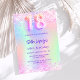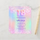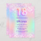 Um convite de aniversário 18º feminino e feminino. Na frente: Um arco-íris, fundo holográfico colorido em roxo, rosa, verde-menta. Decorado com confete cor-de-rosa penteado. Personalize e adicione um nome e detalhes da parte. O nome é escrito com um script de estilo manuscrito, letras cor roxa. 1 folha = 1 convite impresso de borda a borda.