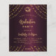 Um fundo de gradiente profundo decorado com estrelas de ouro falsas e um boné. Personalize e adicione um nome, detalhes da festa e ano. O texto Graduação e o nome são escritos com um script de estilo moderno, escrito à mão. 1 folha = 1 convite impresso de borda a borda.