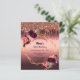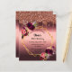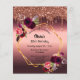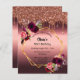 Na frente: um convite para uma festa de aniversário de 50ª (ou qualquer idade). Um fundo de gradiente arrojado com uma falso estrutura geométrica dourada. Decorados com flores roxas escuras e burgueiras, rosas e penas do estilo "boho". Lixiviação de bronze falsa. Modelos para um nome e detalhes da festa. O nome é escrito com um script de estilo manuscrito, letras pretas. 1 folha = 1 convite impresso de borda a borda.