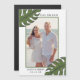 Imagem fotomagnética tropical salvará as datas com duas folhas de palma ilustradas com grande mão verde, uma no canto superior esquerdo e outra no canto inferior direito e um quadro em volta da sua imagem vertical favorita, sobre um fundo branco. Esta design é perfeita para um casamento de verão numa praia tropical.