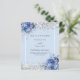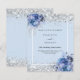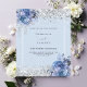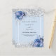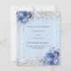 Um fundo azul claro decorado com rosas azuis, flores e confete prateado sujo. Personalize e adicione seus nomes e detalhes do casamento. Letras negras. 1 folha = 1 convite impresso de borda a borda.