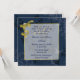 Elegante convite de festas de aniversário de casamento, feito em tons de azul e dourado. Gráficos de fundo azul escuro, com floreados florais bonito e borboletas e uma área de texto branco e dourado semitransparente, no meio. Gráficos realistas de uma reviravolta dourada com um arco amarelo-ouro decoram a parte superior esquerda da área de texto. O texto em azul é totalmente personalizável e pronto para personalizar o seu evento de casamento. Adorável convite para casamentos, aniversários, festas de aniversário e muito mais.
