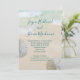 Convites de casamento na praia com desenho de dólares de areia. A areia da praia e a água azul-esverdeada tropical são o fundo para o texto. Os nomes completos do casal, em escrita moderna à mão, no topo do papel, com um parágrafo de texto impresso abaixo. Espaço de texto suficiente é fornecido para um endereço de recepção e / ou site de casamento / outras informações. A redação é perfeita para um pequeno encontro casual. Dólares de areia brancos naturais decoram as bordas.