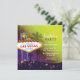 Sinal de Las Vegas lindo + estrelas coloridas e brilhantes e silhuetas de palmeiras altas + fundo amarelo e roxo ilustrados em convites personalizados para despedida de solteiro. Cartão de convite único e elegante que você pode personalizar totalmente para a sua despedida de solteiro ou despedida de solteira em Las Vegas! ((Você pode encontrar os itens essenciais e lembrancinhas de casamento correspondentes nesta loja, Bridal Heaven. Contate ujean4791@gmail.com para trabalhos personalizados e/ou papelaria de casamento coordenada.))