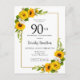 Lindo cartão de aniversário de 90 anos com girassóis amarelos. Peônias amarelas e margaridas brancas se misturam com os girassóis. Uma moldura retangular dourada dá um toque elegante. Muito fácil de personalizar. O verso tem um buquê de girassóis. É perfeito para uma celebração de aniversário de verão. Este item faz parte da coleção Girassol Amarelo e Margarida Branca.
