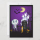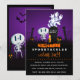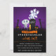 Um convite de cartão de Halloween divertido e assustadoramente fofo. Ambientado em um cemitério escuro e assustador. Uma lápide diz RIP, com uma vela e algumas caveiras brilhantes no chão. Uma velha cerca rangente inclina-se para o lado. Um esqueleto fofo e sorridente está acenando e alguns fantasmas legais estão girando no ar. Definido em um fundo gradiente preto e roxo. Personalize com os detalhes da sua festa de Halloween espetacular. Festa à fantasia ou festa de doces ou travessuras ou qualquer que seja o tema da sua festa de Halloween, o título pode ser facilmente personalizado.