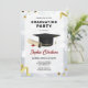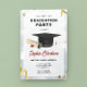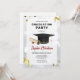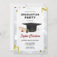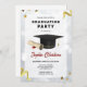 Um convite simples e bonito com boné de formatura, diploma e confete de ouro sobre fundo espumante