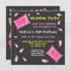 A parte de trás da carta tem tudo o que uma jovem precisa para uma festa de sono de excelente. A frente tem travesseiros com penas voando. Personalize a cópia para a festa perfeita! Consulte os produtos correspondentes abaixo: com