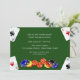 Um convite perfeito para despedidas de solteiro ou eventos de cassino. O design apresenta fichas de pôquer, dados e um Ás de cada naipe nos cantos em um fundo com aparência de feltro verde.
