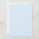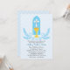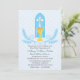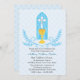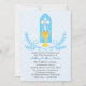 Um convite da Primeira Comunhão apresenta uma janela de igreja azul com cruz e cálice de ouro, acentuados com um design azul de folha ornamental. O fundo azul tem um padrão circular azul e branco que se repete no verso em uma sombra azul mais escura. (Gráficos AMBilustrações ©2017)