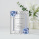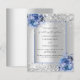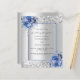 Fundo de aspecto fino prateado decorado com rosas azuis, flores e confete. Personalize e adicione seus nomes e detalhes do casamento. Letras negras. 1 folha = 1 convite impresso de borda a borda.